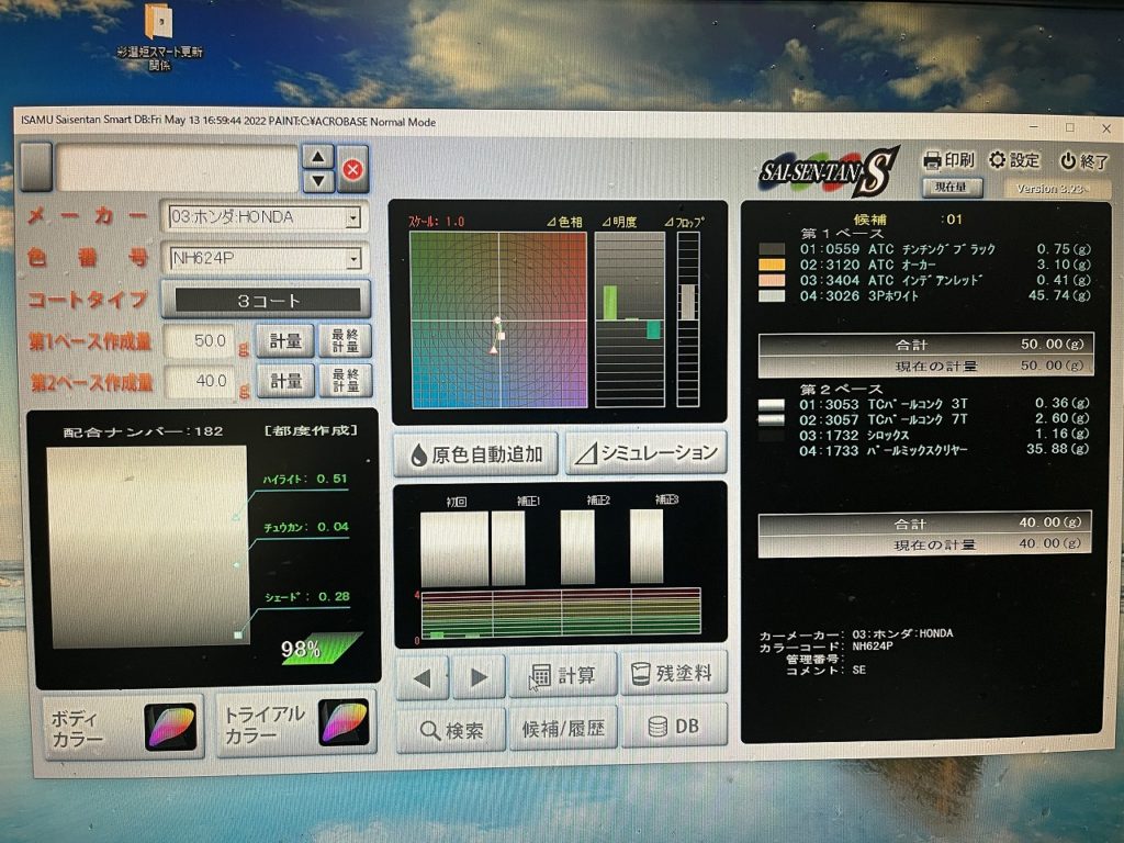 調色機のカメラでボデー色をスキャンしてパソコンに取り込みます。