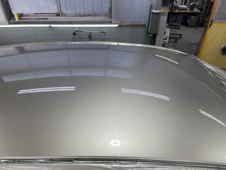 鉄板の上に、グレーの塗装、白の塗装、メタリックベース、クリアーと4層になっています。