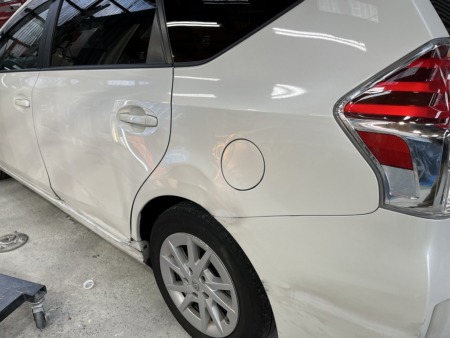 ドアとフェンダーの大きなへこみ修理事例(プリウスα)