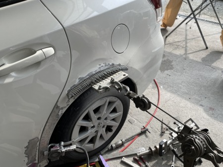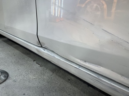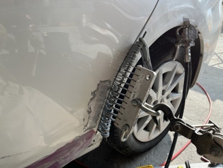 ドア下からパネルをまっすぐに伸ばして修正していきますが、なかなか戻りません。