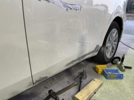 サイドスポイラーを外し、フロントドアの板金から進めます。