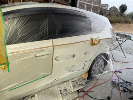 サフェーサーを研磨して、塗装面を脱脂、足付けして塗膜の密着をよくします。